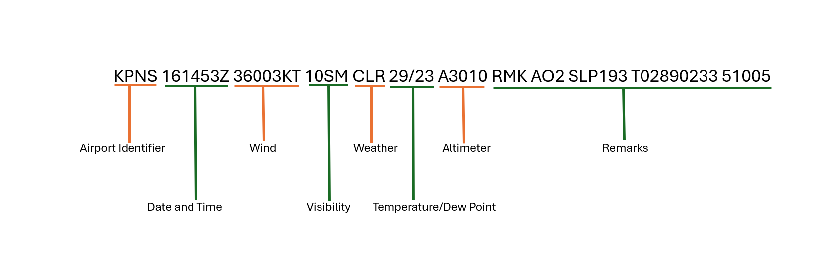 In order to understand virtual weather reports and forecasts you must also understand real world weather reports and forecasts and we will cover that in this section. Weather is one of the most important things to understand if you are going to take to the skies and there are many ways we can check the weather and one of the most important ways for pilots is going to be through what is called METAR or Meteorological Aerodrome Report, METAR's are put out at every airport for the local weather conditions. The format for METAR's might be intimidating at first as they may look like a bunch of numbers and letters but this picture will help you to understand it better.